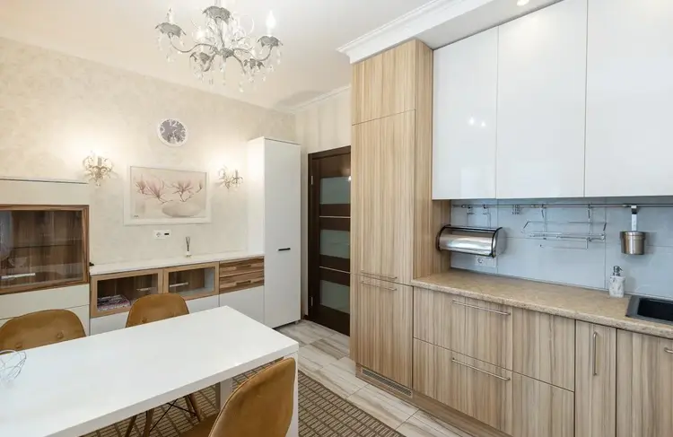 Кухня выполнена из прочных материалов, установлены доводчики Blum. Установлен фильтр с многоступенчатой системой очистки воды (обратным осмосом) Atoll для получения питьевой воды прямо из крана.
