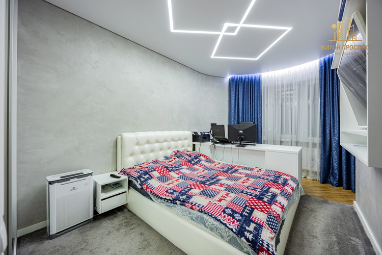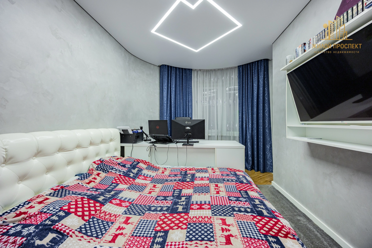 - Общая площадь квартиры по СНБ составляет 100,1 кв.м. Просторная спальня с гардеробной- зонирована на спальную зону и кабинет. 2 большие комнаты, в каждой комнате есть шкаф. В каждой комнате встроенное рабочее место.