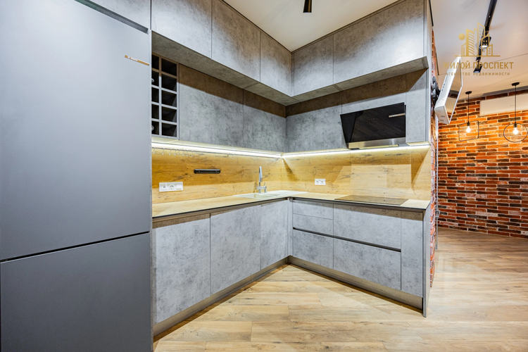 Кухня оборудована современной техникой: духовой шкаф Bosch, встроенная микроволновая печь и кофемашина Bosch, варочная поверхность Bosch, холодильник Bosch , посудомоечная машина Hotpoint-Ariston. Фасады Egger, фурнитура Blum, которая обеспечивает долговечность и комфорт в использовании.
