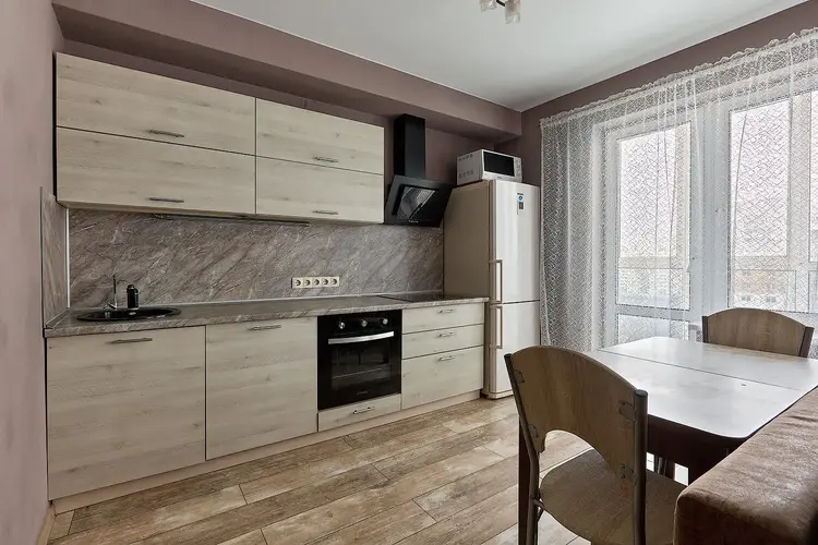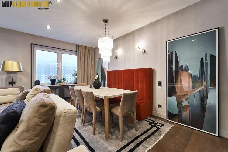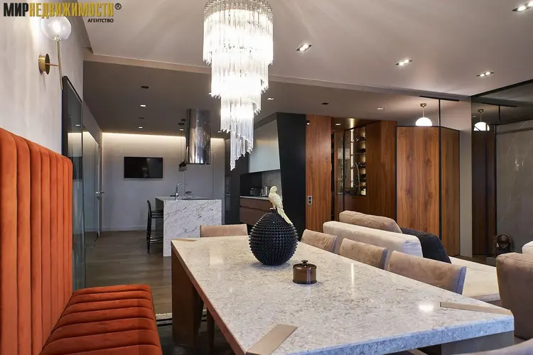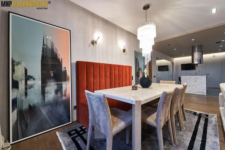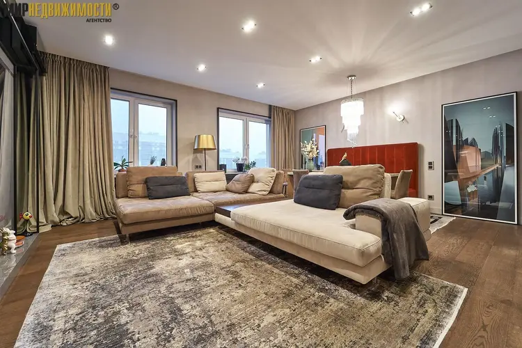 Интерьер квартиры выполнен в спокойной тёплой цветовой гамме. Отсутствие излишних деталей и элементов, наличие натуральных отделочных материалов, грамотные и удобные планировочные решения - всё это создаёт атмосферу уюта и комфорта. В отделке помещений и мебели использованы только премиальные экологически чистые, сертифицированные материалы ведущих европейских производителей, в том числе, вся бытовая техника.