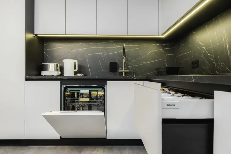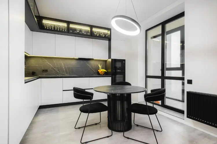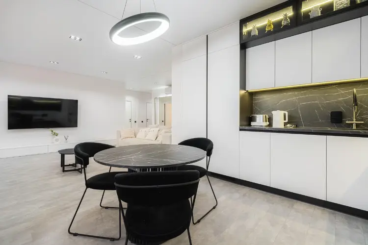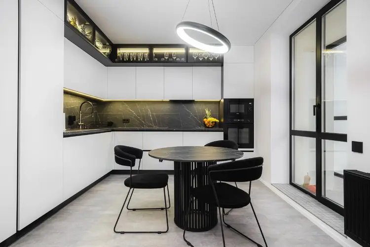 Современный стильный кухонный гарнитур с фурнитурой Blum оборудован всей необходимой для комфортной жизни техникой бренда Weiissgauff – встроенные духовой шкаф, микроволновая печь, индукционная варочная поверхность, вытяжка, посудомоечная машина; встроенный холодильник; фильтр для питьевой воды с трехступенчатой системой очистки.