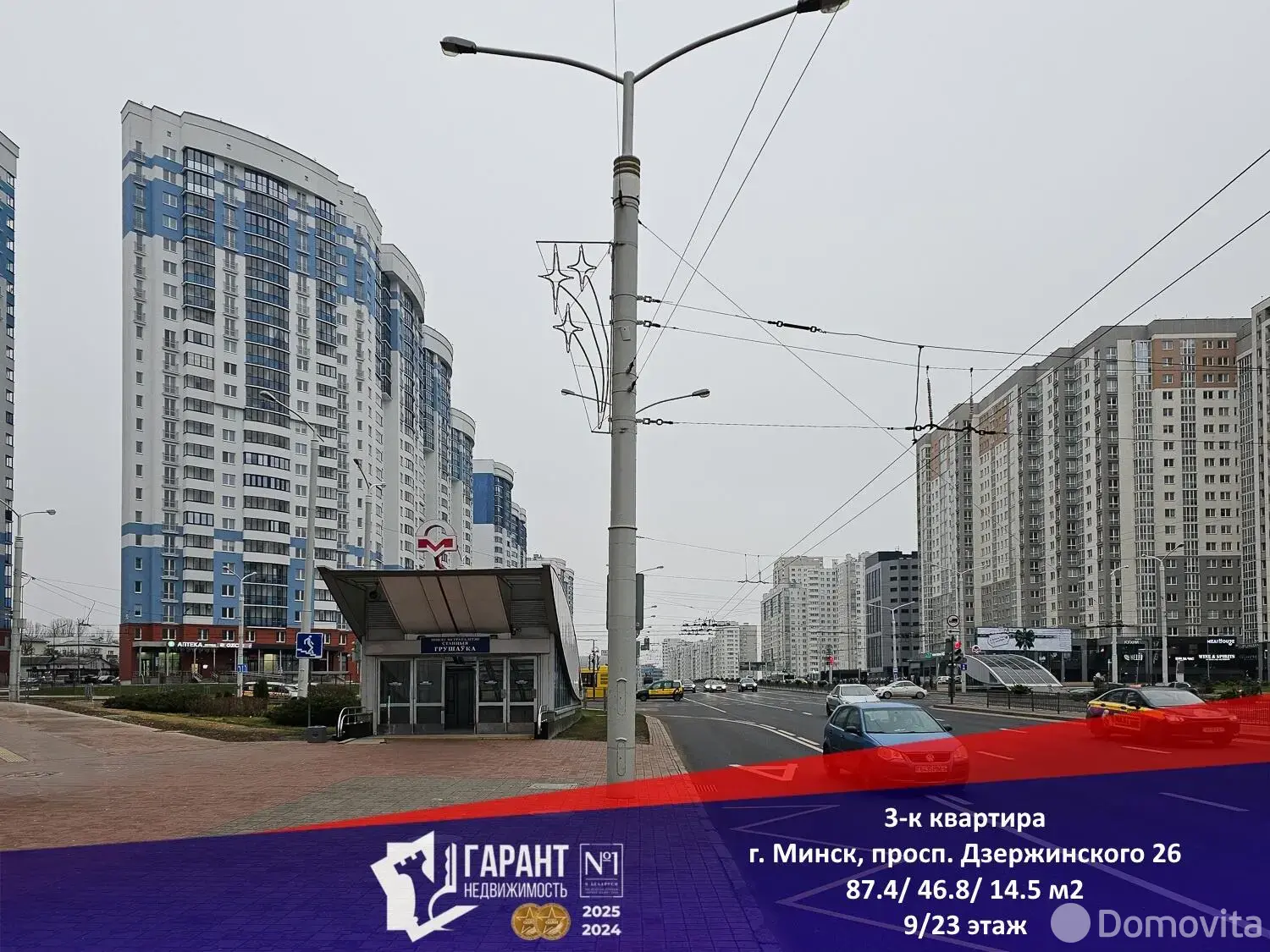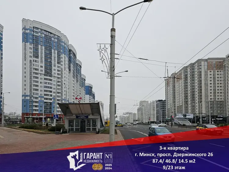 Доступна к покупке просторная и светлая 3-х комнатная квартира в каркасно-блочном доме в центре Минска около станции метро «Грушевка» по адресу пр-т Дзержинского, 26, площадью 87.4 кв.м. с тремя изолированными комнатами на две стороны, большой кухней 14.5 кв.м. и двумя санузлами.