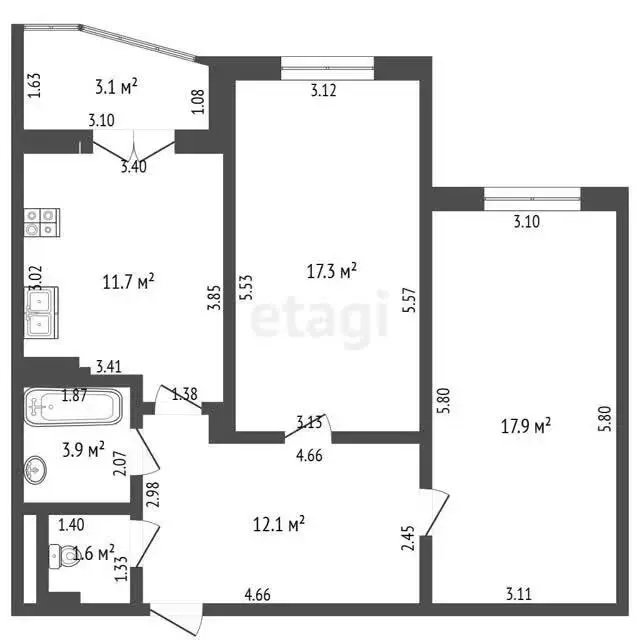 Квартира с удобной планировкой, комнаты имеют правильную форму. Площадь жилых комнат 16.3 кв.м., 16.1 кв.м., 14.4 кв.м.