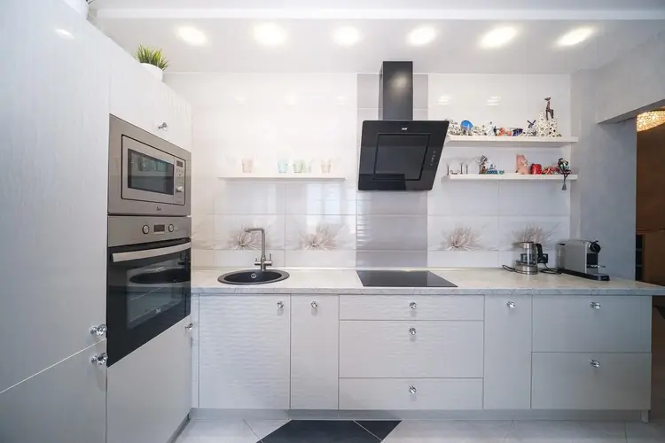 Встроенная кухня укомплектована всей необходимой мебелью и техникой. Фасады 3D придают кухне-гостиной особый лоск.