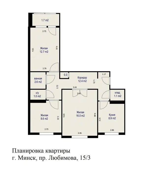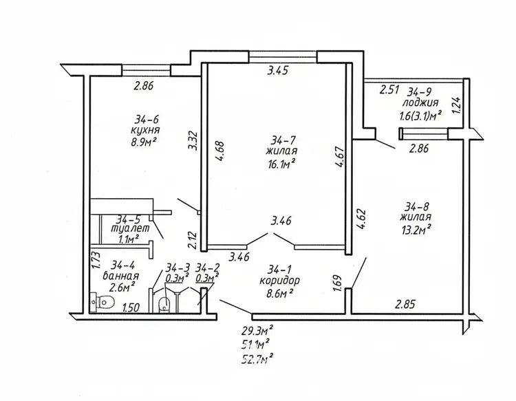 Продается просторная 3-комнатная квартира, общая площадь 65.3 кв.м., жилая 37.3 кв.м., кухня 8.9 кв.м.