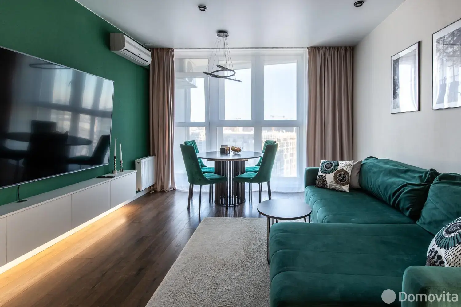 В зоне гостиной-столовой установлен кондиционер, обеденный стол – трансформер, раскладывающийся диван с полноценным спальным местом.