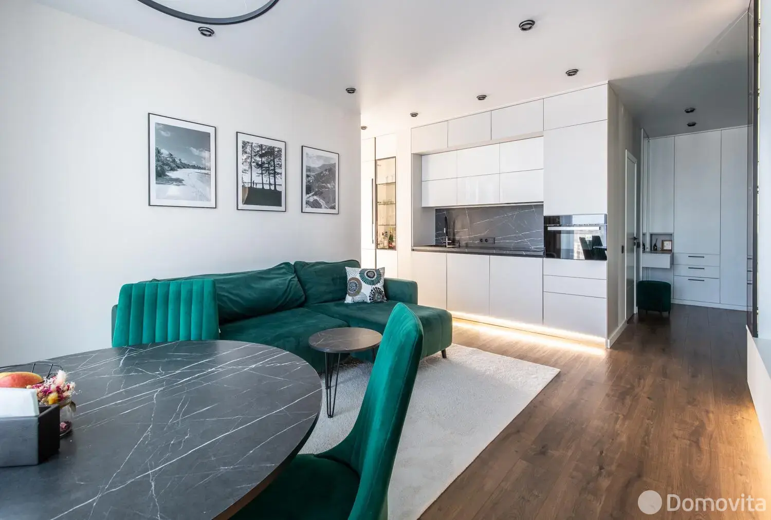Встроенная кухня оснащена всей необходимой бытовой техникой: варочной поверхностью Maunfeld, духовым шкафом + СВЧ -печь Maunfeld, посудомоечной машиной 60 см Maunfeld, встроенным холодильником Gorenje, встроенной стиральной машиной с сушкой Maunfeld, установлена система очистки воды Аквафор.