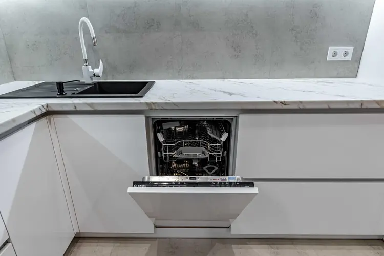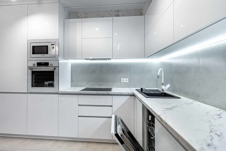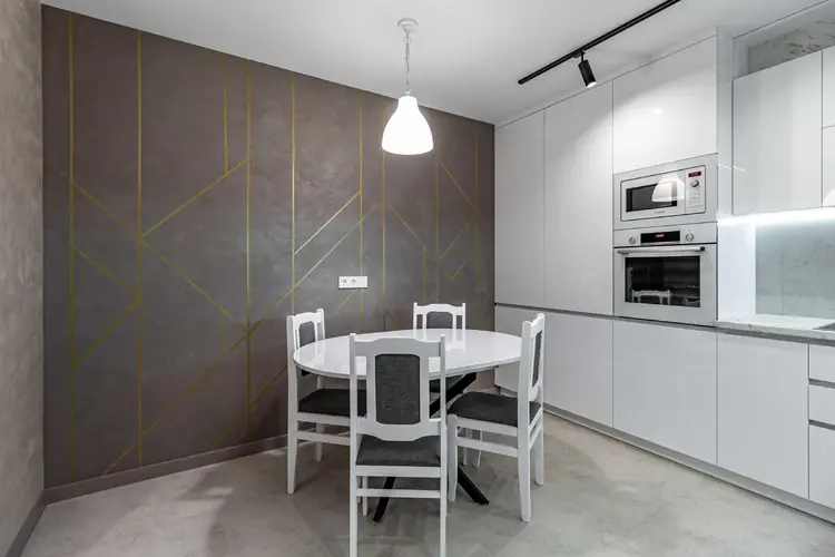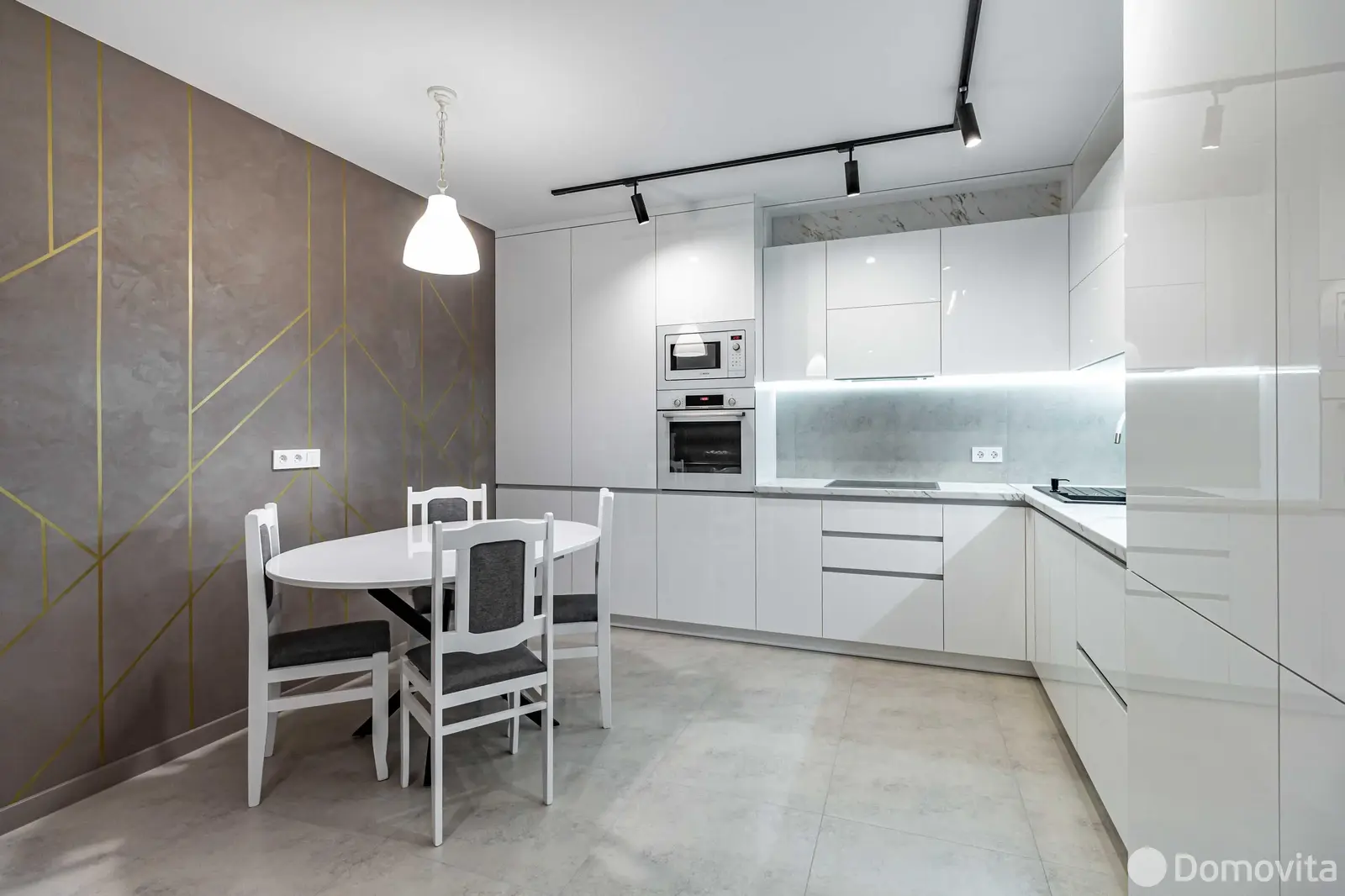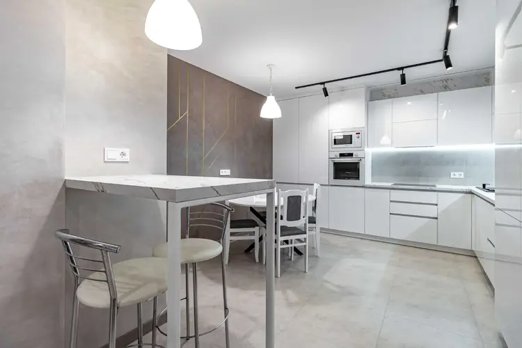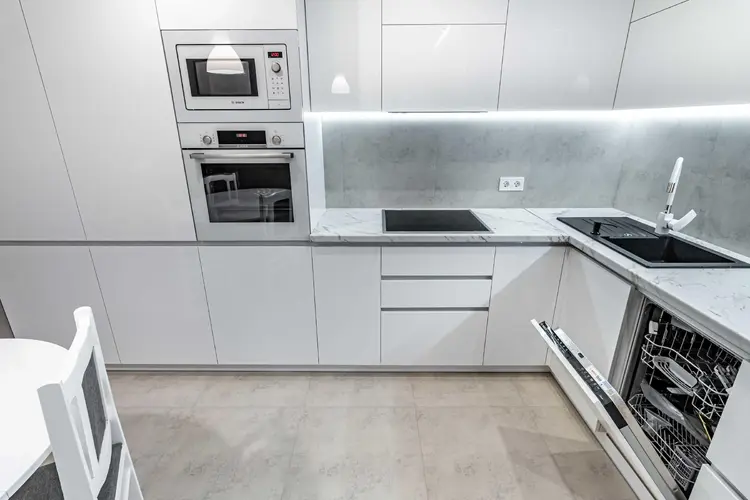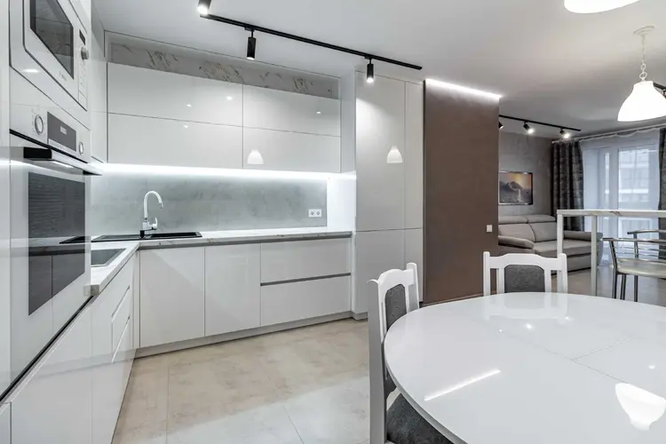 Стены квартиры покрыты декоративной штукатуркой, за исключением спален, где в одной из них отделка выполнена на стене за изголовьем кровати. Полы по всей квартире, включая балкон, а также стены в ванной и туалете облицованы прочным и элегантным керамогранитом. Установлен теплый пол для дополнительного комфорта. Просторная кухня-гостиная с практически всей техникой Bosch — это тренд последних лет.