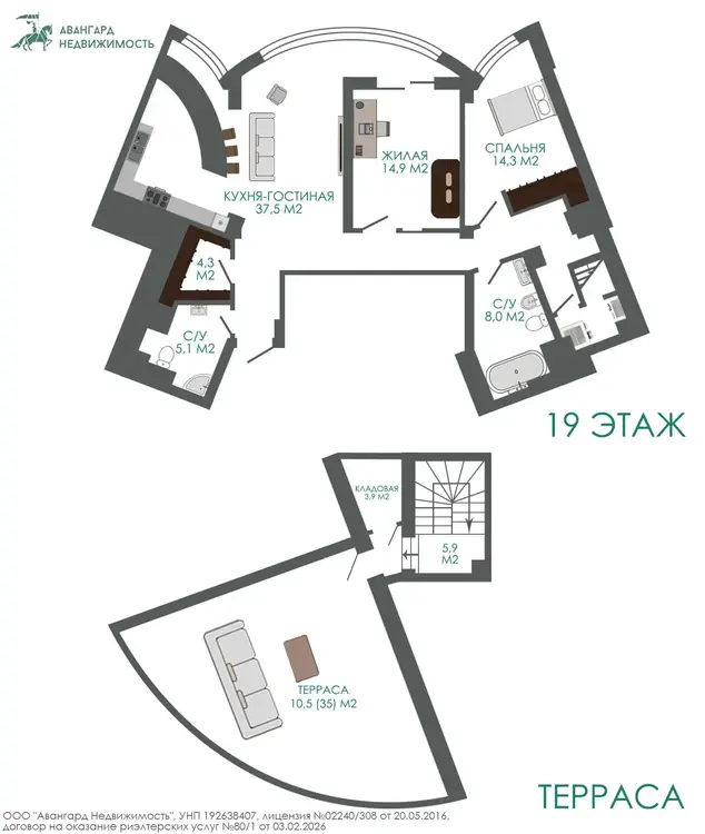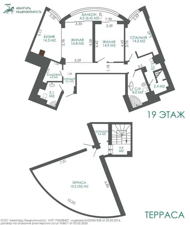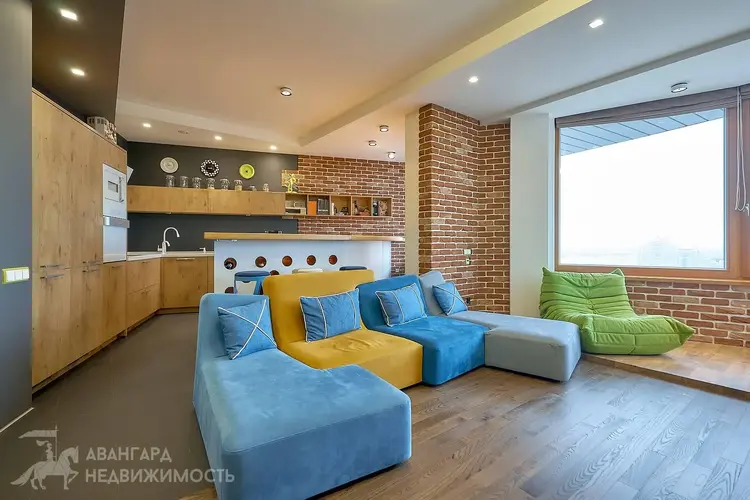 Квартира расположена на последнем 19-ом этаже современного жилого комплекса «Славянский квартал», пр-т Победителей 27.