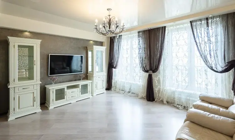 - Мебель в гостиной и кухонный гарнитур из натурального дерева