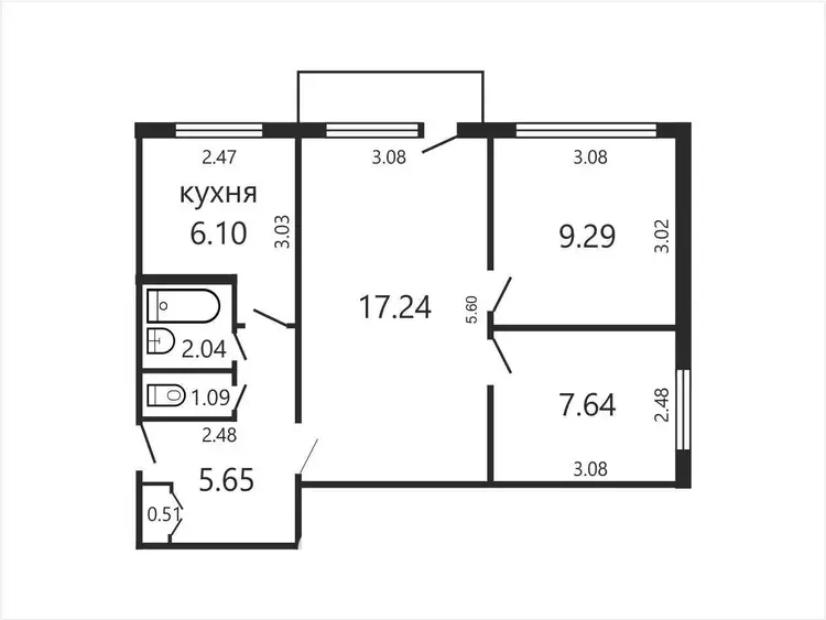 Квартира общей площадью 49.5 кв.м (жилая 34.17 кв.м, кухня 6.1 кв.м) расположена на комфортном втором этаже 5-этажного панельного дома. Высота потолков 2.52 м.