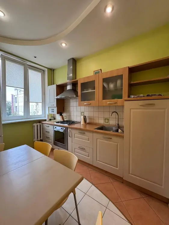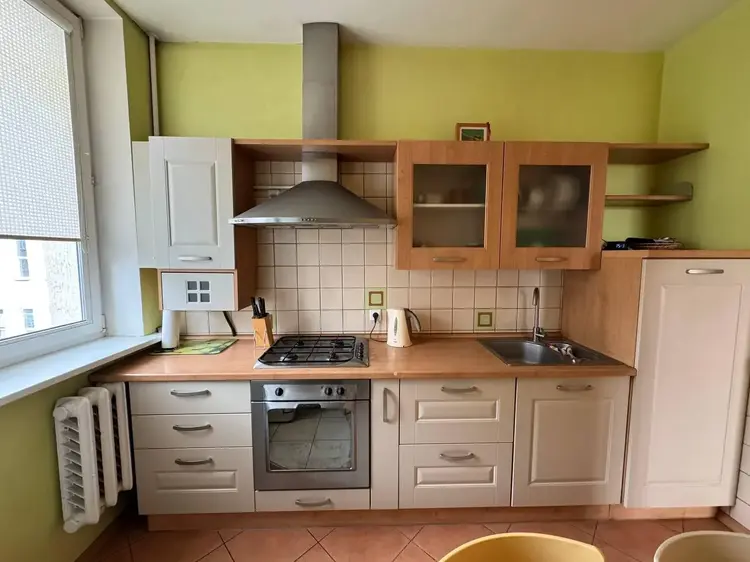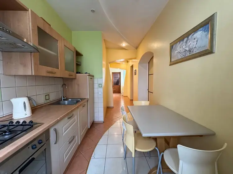 Кухня: просторная 7,6 кв.м ,светлая, со встроенной бытовой техникой и обеденным столом . Пол -плитка.