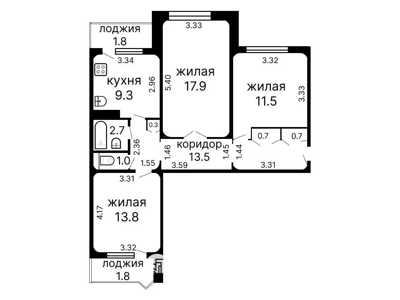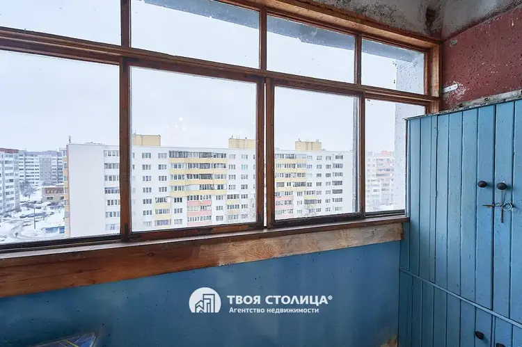 Квартира общей площадью 71.4 кв.м расположена на 9 этаже 9-этажного дома 1981 года постройки. Жилая площадь квартиры составляет 43.2 кв.м, а уютная кухня — 9.3 кв.м. Площадь квартиры по СНБ 75.1 кв. м. 2 Две застекленные лоджии, выход из кухни и жилой комнаты.