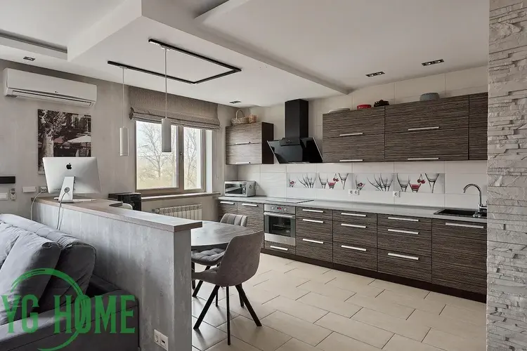 Встроенная кухня с посудомоечной машиной, варочная поверхность, духовой шкаф, вытяжка.