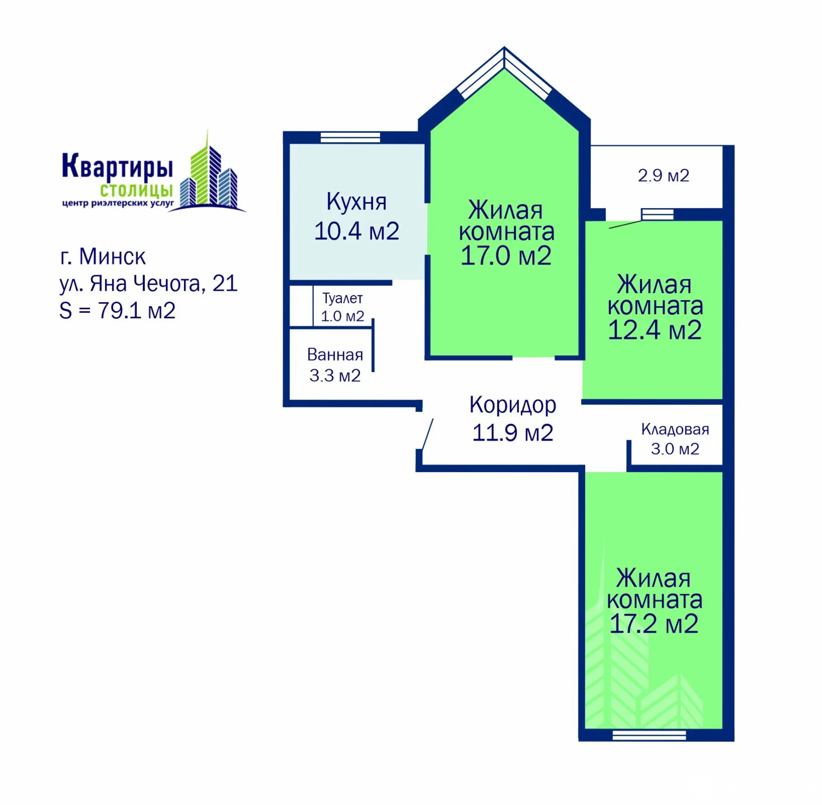 Общая площадь по СНБ 79.1м2, жилая площадь 46.6 м2, просторная кухня 10.4м2, а также кладовая 3м2.