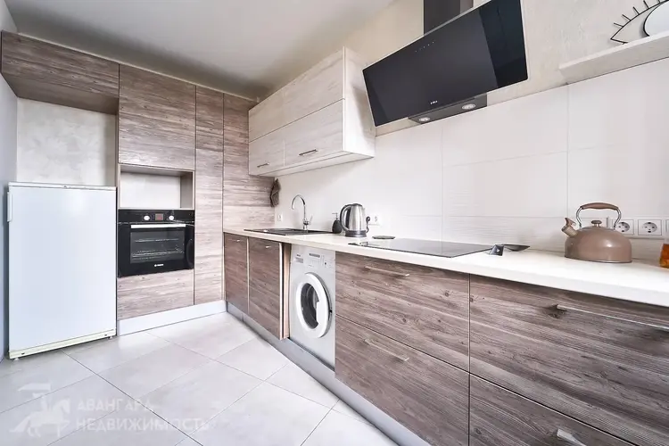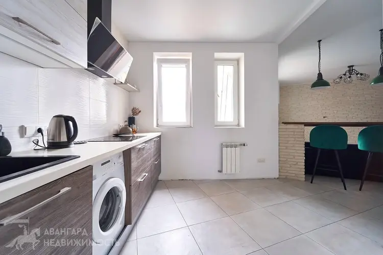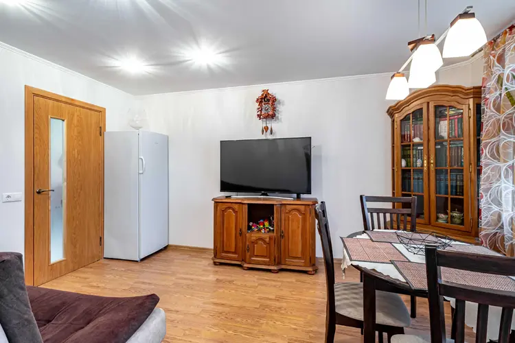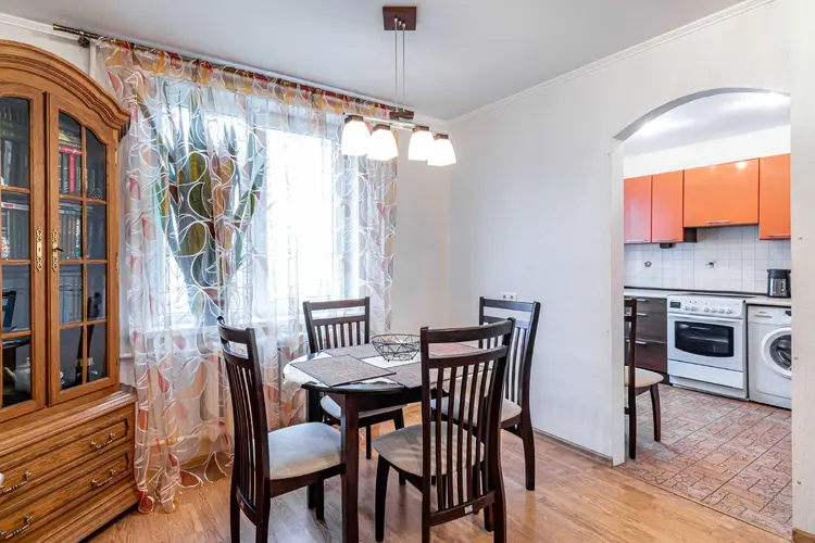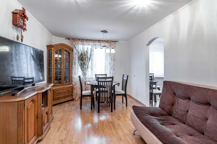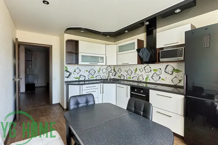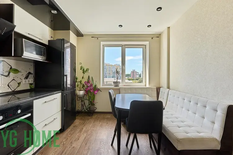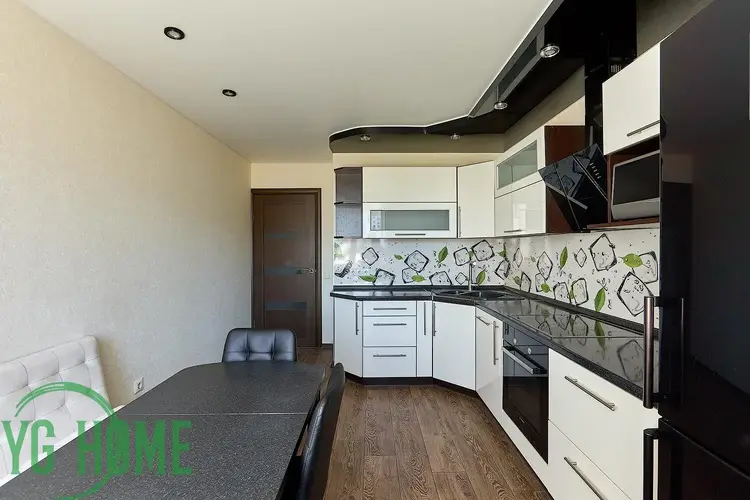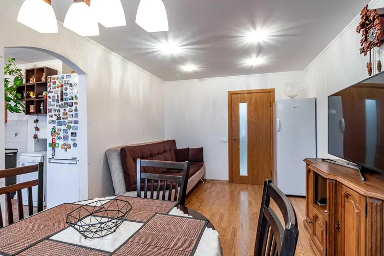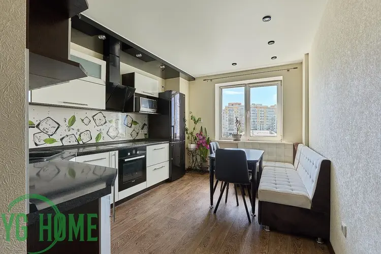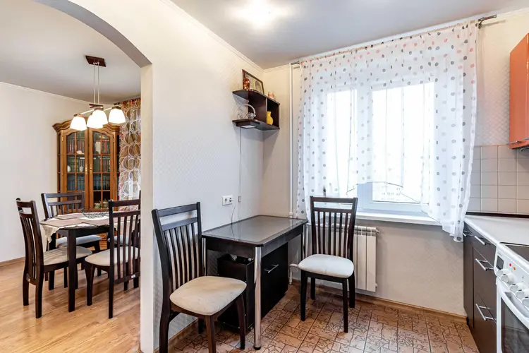 -Грамотная перепланировка, узаконенная официально, сделала пространство ещё удобнее. Теперь кухня объединена с гостиной, что позволяет наслаждаться общением с семьёй и друзьями, не отвлекаясь от домашних дел.