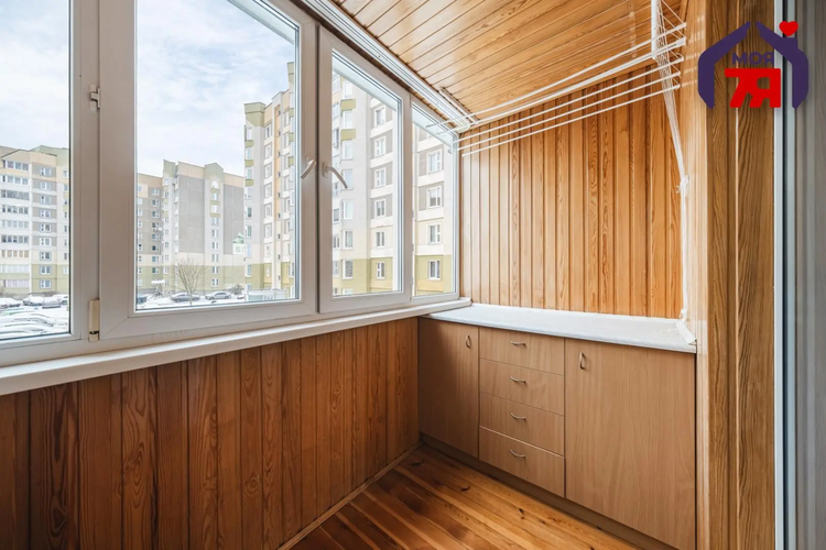 -Застеклённая лоджия, обшитая вагонкой, — это ещё одно уютное место, где можно устроить зону отдыха или мини-кабинет.
