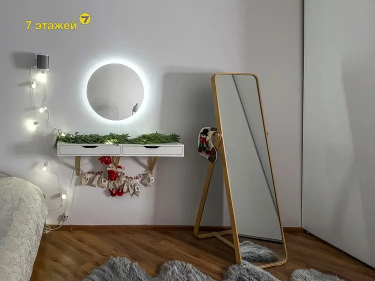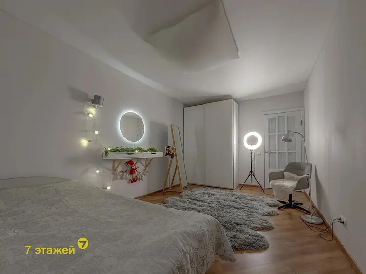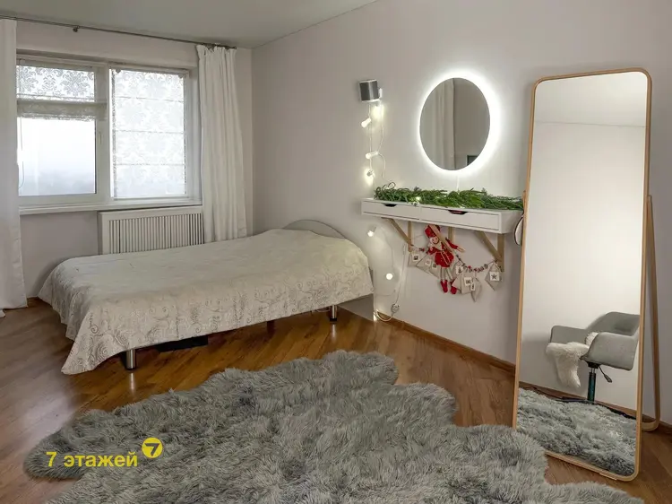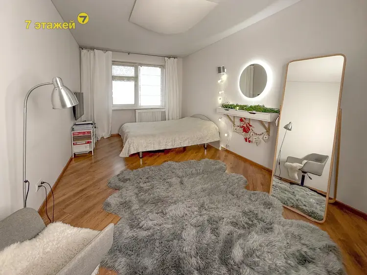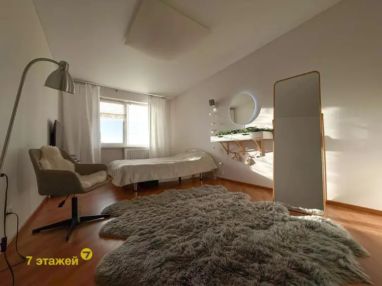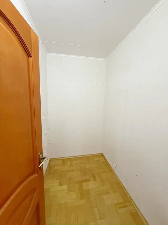 В квартире есть вместительная гардеробная, где можно организовать систему хранения. Большая лоджия застеклена и обшита вагонкой.