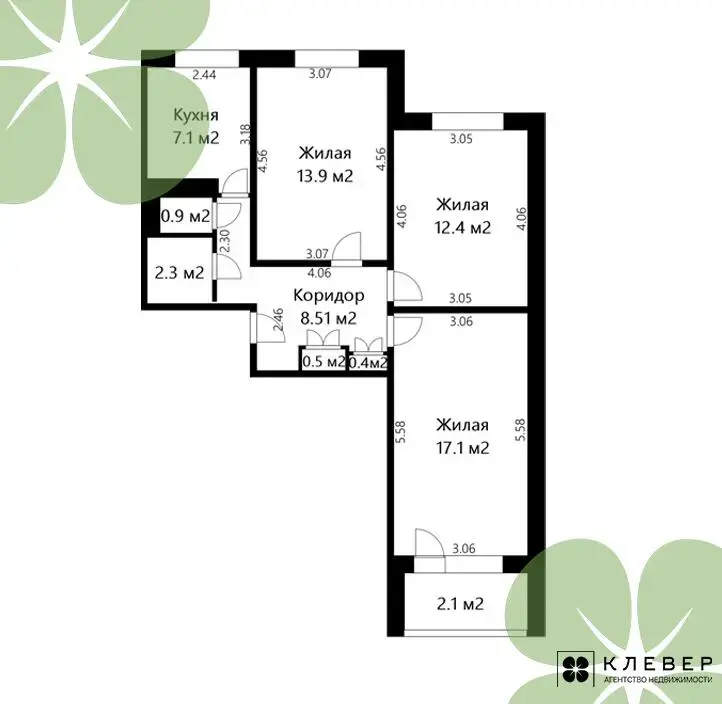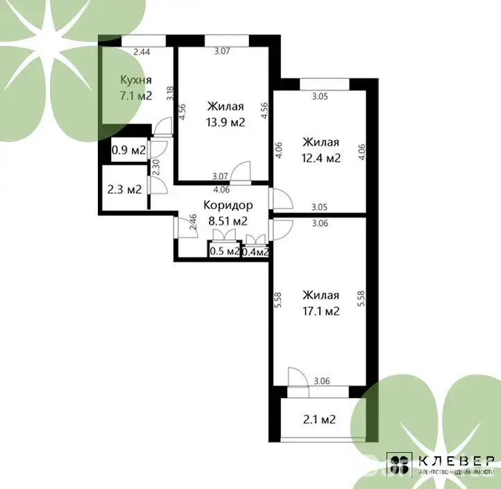 - Жилые комнаты: 17,1, 13,9 и 12,4 кв.м.