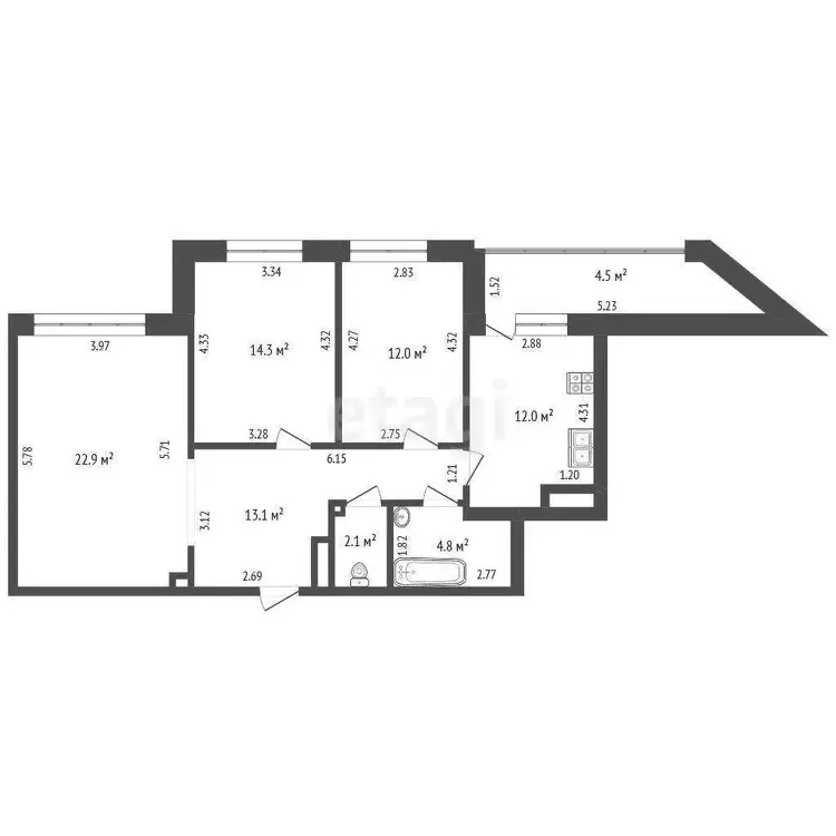 Требуется ремонт. Общая площадь - 82,9 м.кв., жилая – 49,2 м.кв, кухня 12 м.кв.