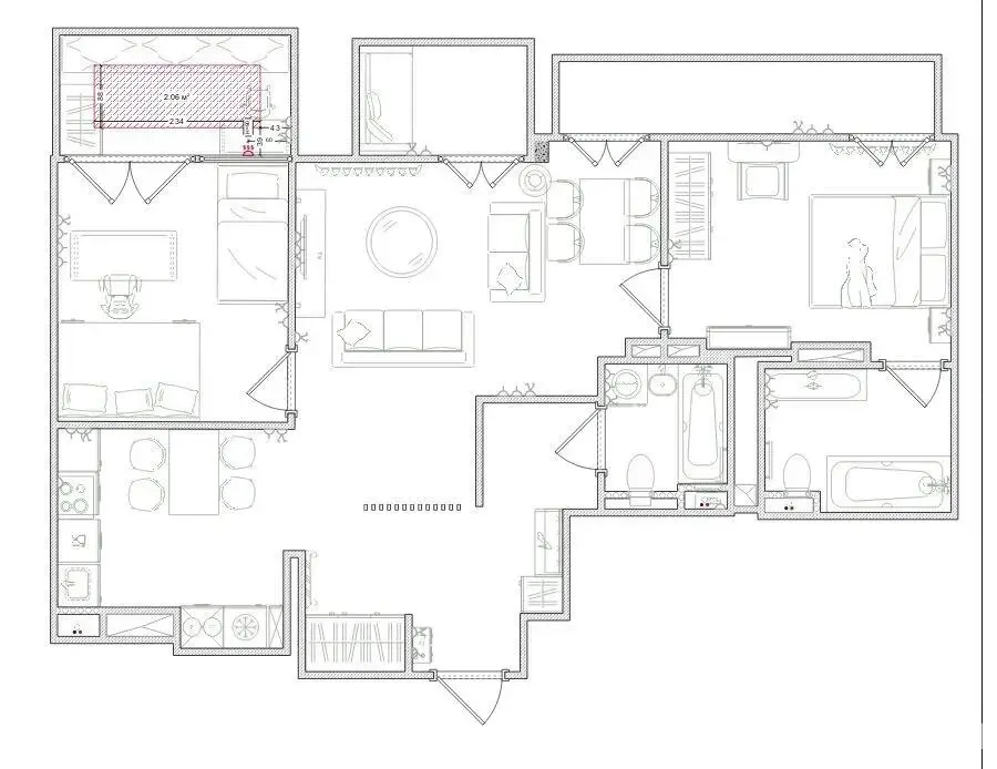 Имеются две отдельные ванные комнаты, с санузлами. Отделаны широкоформатным керамогранитом. Ванны чешского производства.