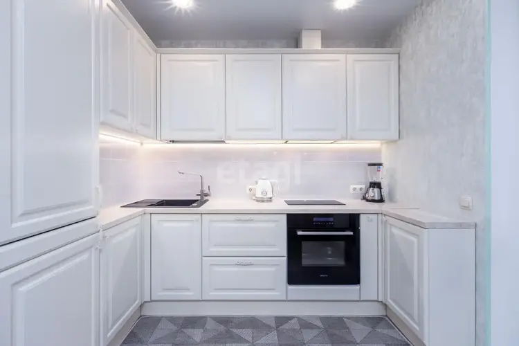 Кухня оборудована всей необходимой встроенной техникой: большая посудомоечная машина, холодильник, варочная панель, духовой шкаф, микроволновая печь.