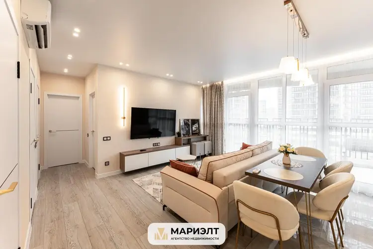 Квартира очень светлая, с панорамным остеклением и хорошим видом из окна. Полностью готова к проживанию, в стоимость включена вся мебель и техника. Продуманная планировка: 2 отдельные спальни, просторная кухня-гостиная, раздельный санузел, есть гардеробная, встроенные шкафы, а также – 2 уютных лоджии.
