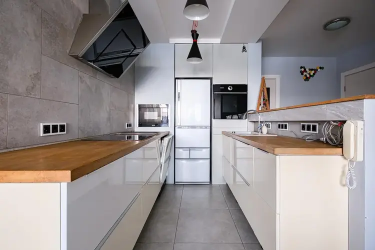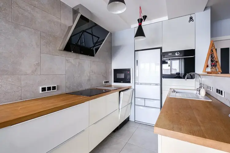 Кухня, с фурнитурой Blum, оснащена качественной техникой: духовой шкаф, микроволновая печь и вытяжка Gorenje; индукционная варочная панель Electrolux; посудомоечеая машина Bosch.