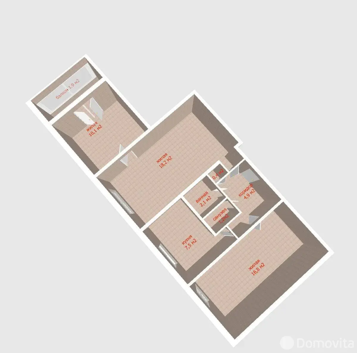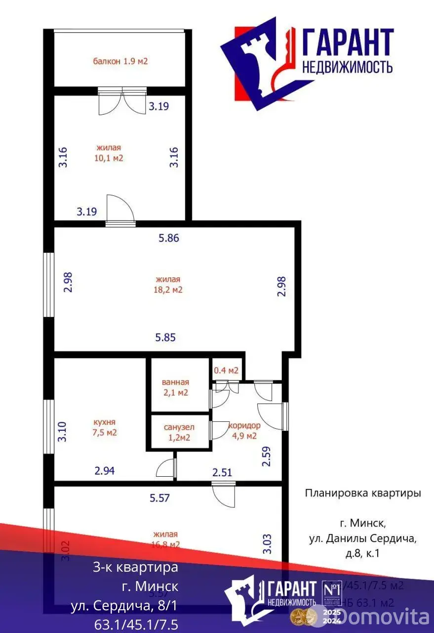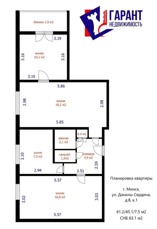 · Площадь: общая 61.2 кв.м (жилая 45.1 кв.м), кухня 7.5 кв.м., (площадь 63,1 по СНБ)