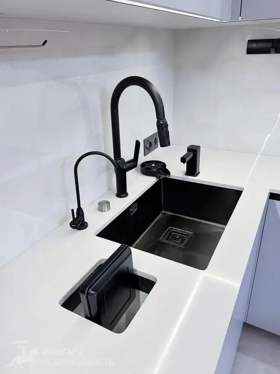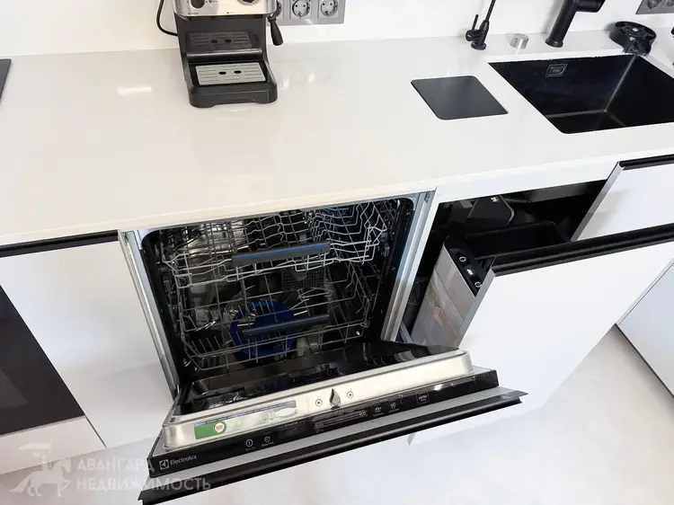 Встроенная кухня со всей необходимой техникой: посудомоечная машина, духовой шкаф, интегрированная мойка с фильтрами, мойкой для стаканов и сенсорным дозатором и прочая кухонная техника, и принадлежности.