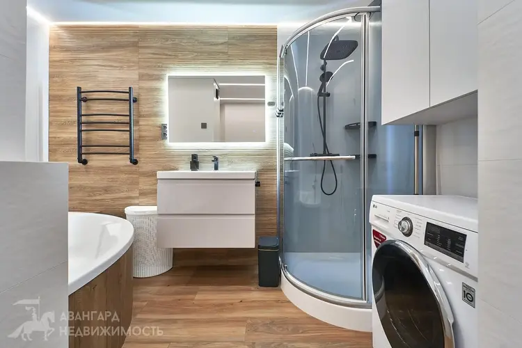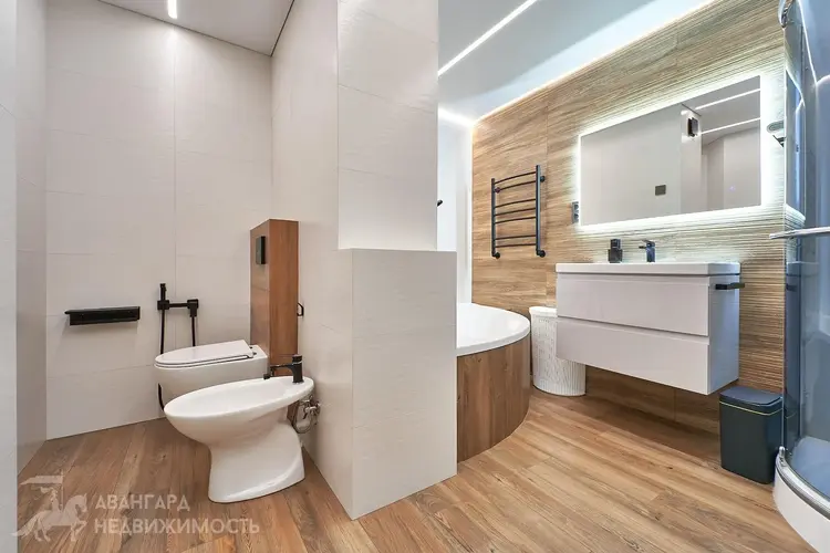 - Напольное покрытие: входная зона и санузел – керамогранит, кухня – кварц-винил, жилые – паркет.