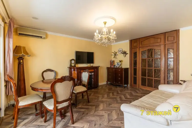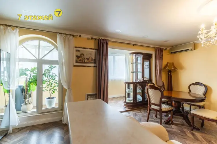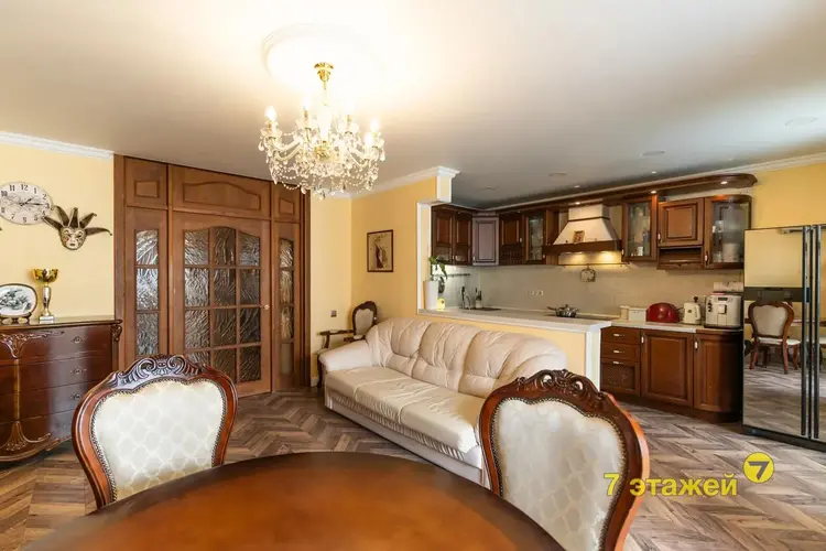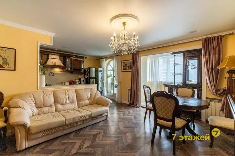 Квартира расположена на 3 и 4 этажах кирпичного дома 1998 г.п. и находится в собственности c момента сдачи объекта в 2000 году. Общая площадь квартиры по СНБ 77,7 м2; 2 жилых раздельных комнаты - 11.7 м2 и 9.7 м2; зона гостиной с кухонным оборудованием - 26,8 м2, санузел - 8.7м 2; площадь лоджии - 9 м2.