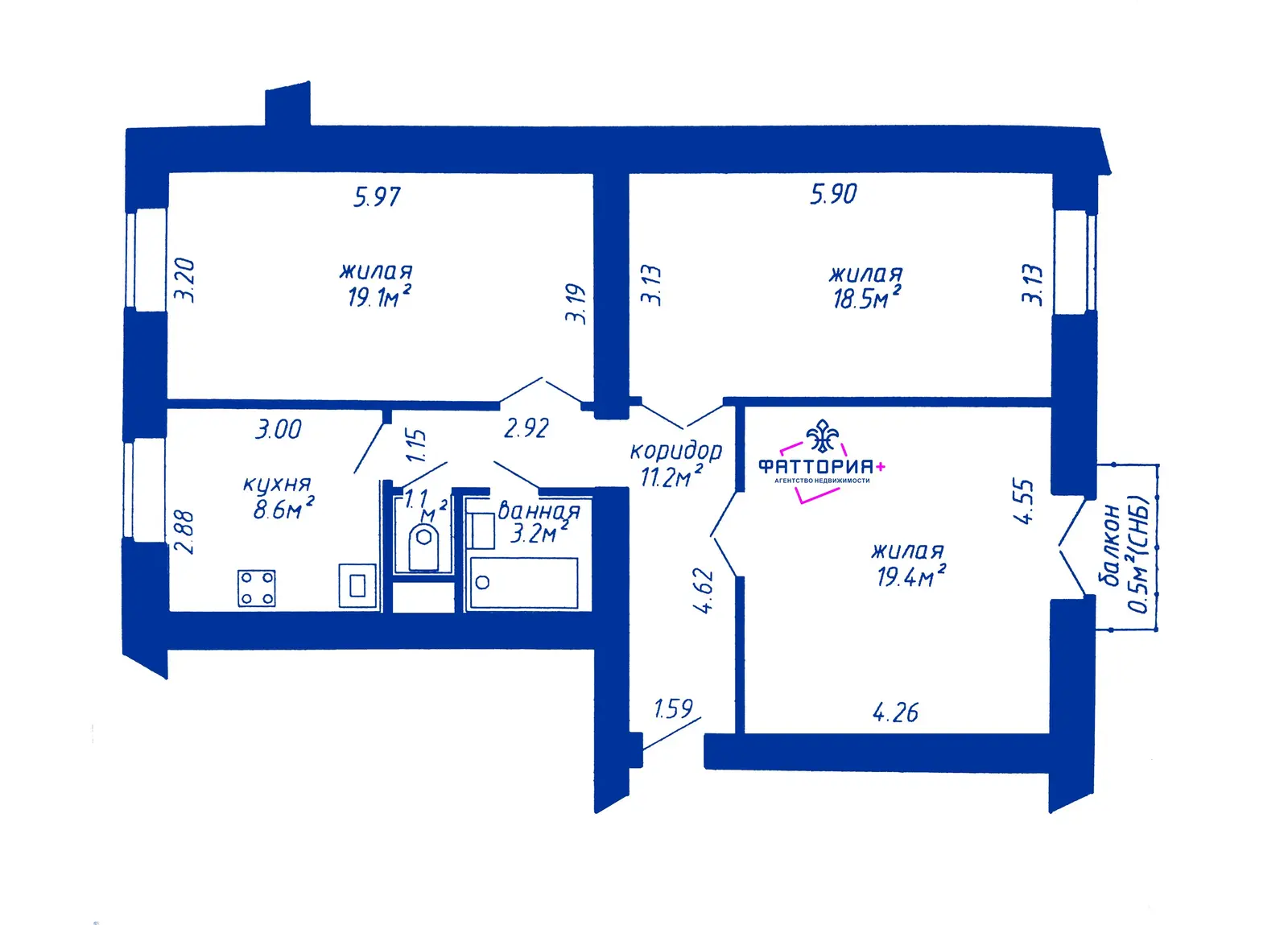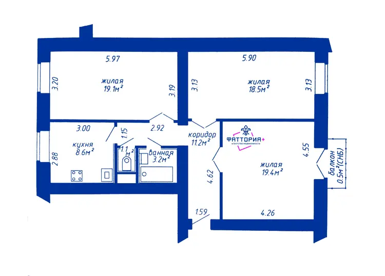 Отличная планировка: большие комнаты 19,4м, 19,1ми 18,5м, просторная кухня 8,3м. Раздельный санузел, балкон с видом на уютный двор.