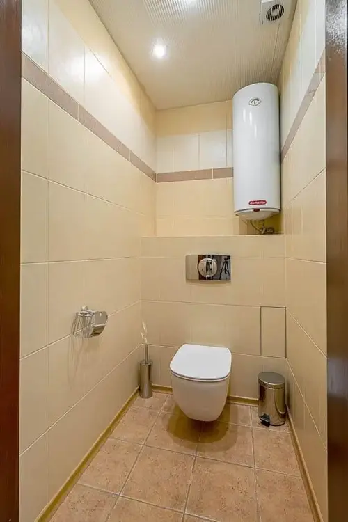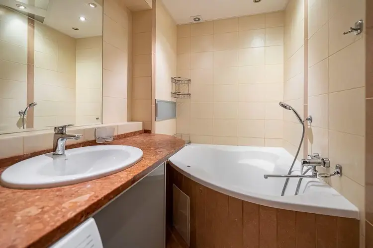 Раздельный санузел облицован плиткой, установлена инсталляция, подвесной унитаз, большая угловая ванна, тумба со столешницей из искусственного камня, современные смесители и принудительная вентиляция.