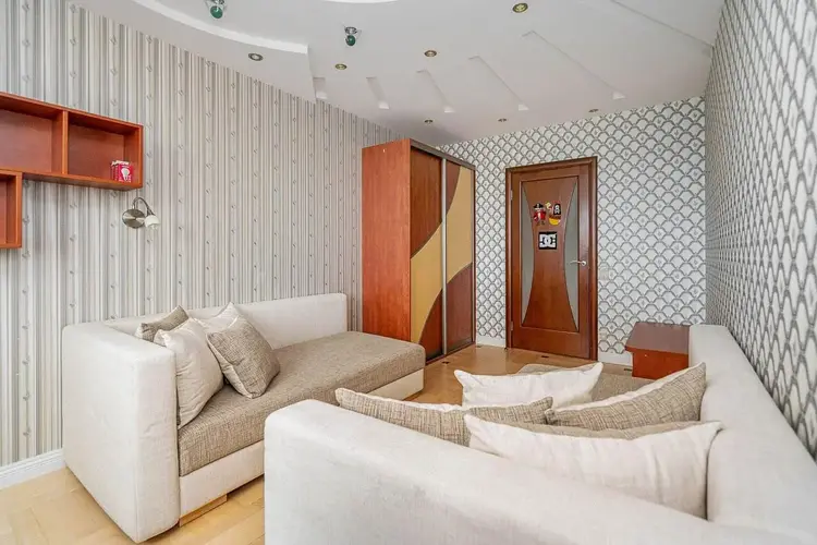 Напольное покрытие в прихожей и в зоне кухни-плитка, а в жилых комнатах паркет, стены оклеены светлыми обоями, потолок выровнен и окрашен с добавлением конструкций из гипсокартона с точечными светильниками и люстрами.