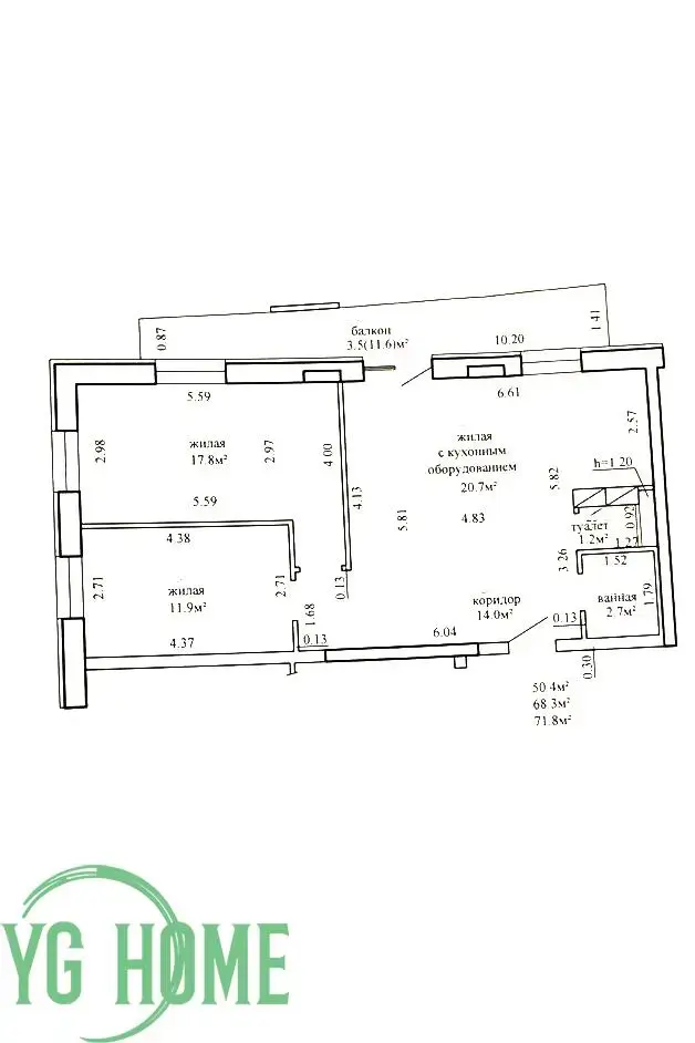 Площадь СНБ- 71,7/ общая 68,3/ жилая 50,4м2