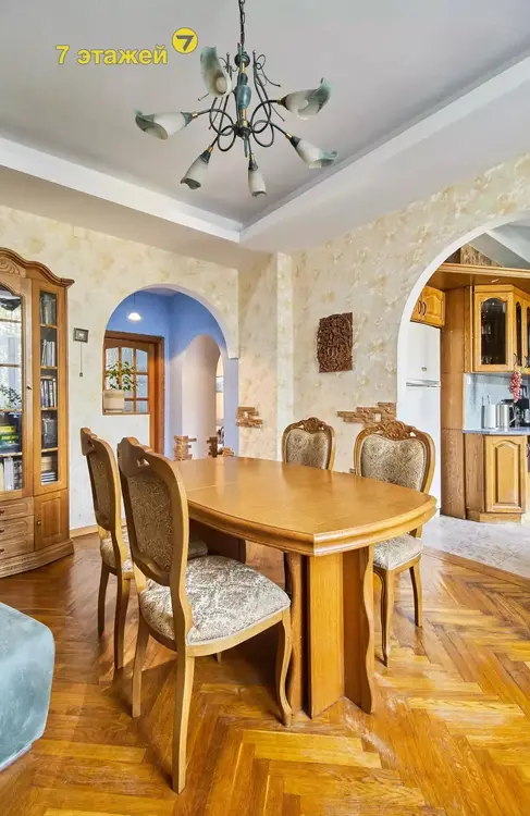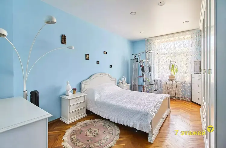 С первого шага Вас встречает просторная прихожая площадью 19,3 м², далее по левой стороне коридора идут две спальни. Первая спальня площадью 19м2 выполнена в мягких, спокойных оттенках: нежно-голубые стены и мебельный гарнитур молочного цвета в классическом исполнении, как нельзя лучше подходят для непревзойденного отдыха и релаксации! Далее вторая спальня размером 14,82 м² — эта комната идеально подойдет как для детской, так и для кабинета. Напротив располагается, грамотно спланированная, кухня-гостиная, обеспечивающая идеальное пространство для приема гостей и семейных ужинов, благодаря обеденной группе на 6-8 человек и большому мягкому дивану с журнальным столиком напротив ТВ зоны, — площадь кухни 7,5 м², гостиной 22,4 м². Полностью оборудованный санузел площадью 5,2 м² с ванной с функцией джакузи и душевой дополняет атмосферу роскоши и комфорта. Насладитесь привлекательной гармонией между историческим очарованием и современными удобствами в этой идеально расположенной «сталинке» в центре Минска!