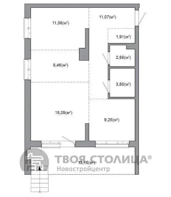Квартира на момент ввода является однокомнатной с возможностью разделения на комнаты по индивидуальному проекту будущего собственника.