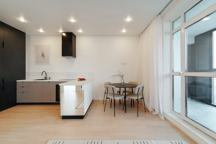 Функциональная часть кухни выполнена в актуальном стиле: без верхних шкафов, при этом имеет полуостров и большое количество мест хранения. Вся бытовая техника встроена: двухкамерный холодильник NoFrost, полноразмерная посудомоечная машина,духовой шкаф, индукционная варочная панель и потолочная вытяжка.
