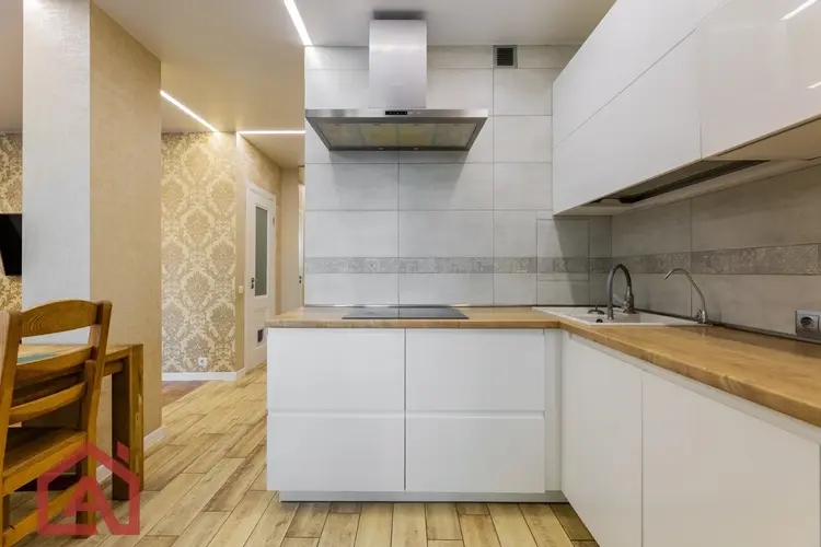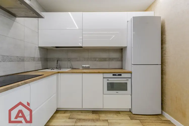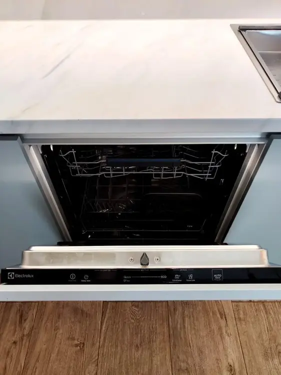 Встроенная кухня со встроенной техникой Electrolux – микроволновка, духовой шкаф, посудомоечная машина, индукционная варочная панель, вытяжка. Встроенный холодильник высотой 2 м.