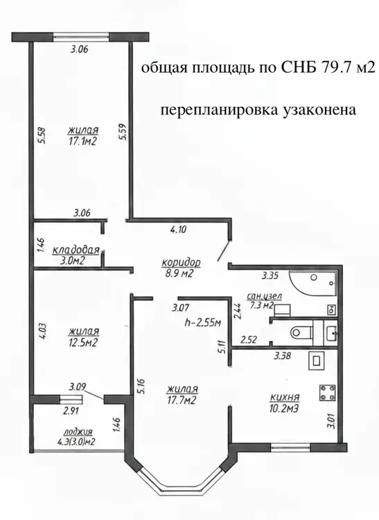 Самая популярная и любимая всеми планировка с кладовкой, где кухня расположена рядом с гостинной и соединены в единое пространство. Удачно совмещен и увеличен санузел, где просторная прихожая с вместительным шкафом-купе и где есть две больших отдельных спальни! Площадь общая 79.7 кв.м (по СНБ), площадь кухни 10.2 м2, площадь санузла 7.3 м2. Перепланировка полностью узаконена. При. необходимости можно сделать три отдельных комнаты и раздельный санузел.