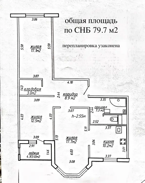 Самая популярная и любимая всеми планировка с кладовкой, где кухня расположена рядом с гостинной и соединены в единое пространство. Удачно совмещен и увеличен санузел, просторная прихожая с вместительным шкафом-купе и две больших отдельных спальни! Площадь общая 79.7 кв.м (по СНБ), площадь кухни 10.2 м2, площадь санузла 7.3 м2. Перепланировка полностью узаконена. При необходимости можно сделать три отдельных комнаты и раздельный санузел.