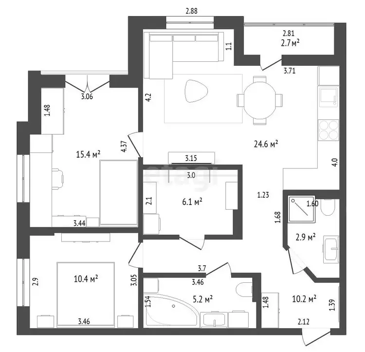 - 2 самостоятельных полнофункциональных с/у: один с/у с большой ванной, инсталляцией, умывальником и стиральной машиной, второй – с душевой, инсталляцией и умывальником;