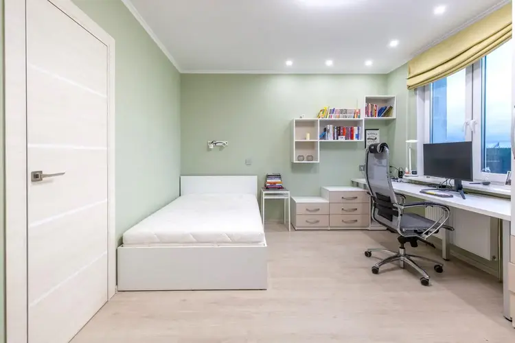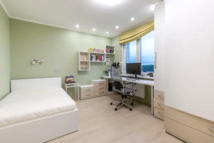 - жилая комната с оборудованным рабочим местом, вместительной системой хранения и кроватью также оборудована системой кондиционирования, имеется 2 окна, в т.ч. панорамным, благодаря чему в комнате много естественного света;