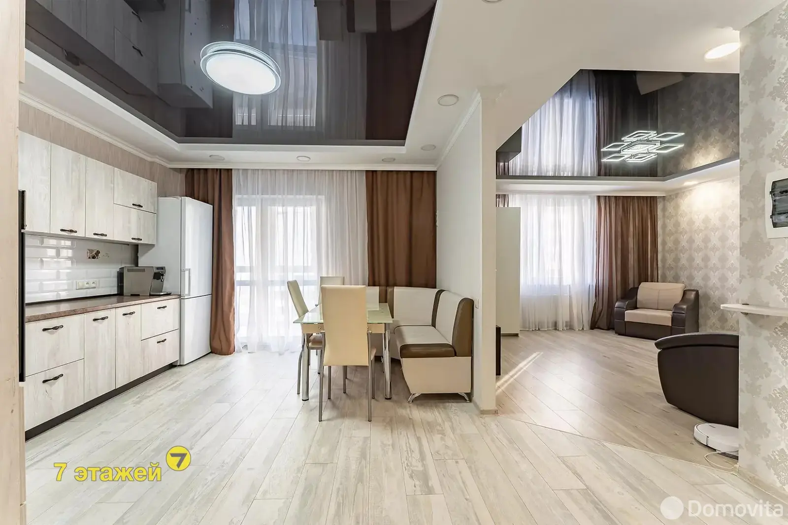 В гостиной: столовая группа, диван, кресла, шторы и люстры. Продумано освещение в несколько уровней.