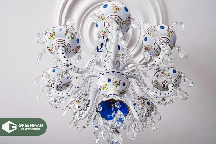 На полу уложена итальянская плитка и сделан теплый пол, на стенах обои, потолки покрашены и установлены шикарные люстры, привезенные из Италии.