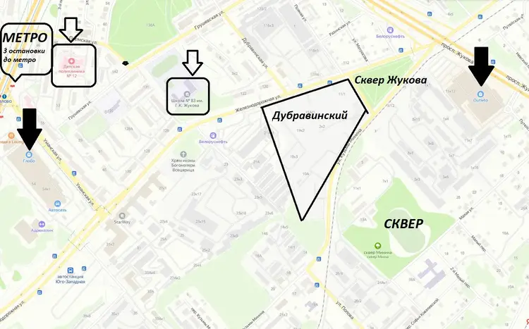 Поблизости сквер сквер им. Минина, сквер им. Г.К.Жукова, школа, поликлиника, торговые центры, несколько остановок до Минск Мира.