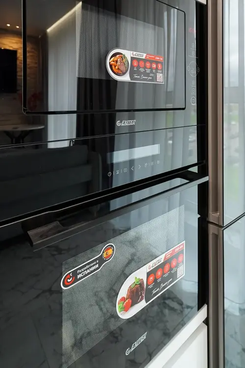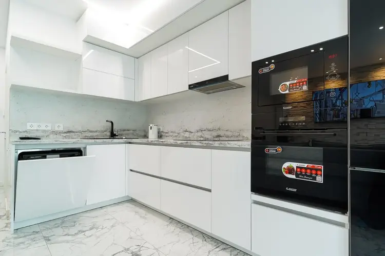 Встроенная кухня (акрил) оснащена надежной качественной фурнитурой и оборудована бытовой техникой: варочная панель Exiteq, духовой шкаф Exiteq, вытяжка, посудомоечная машина Exiteq, микроволновая печь Exiteq , холодильник Bosch.