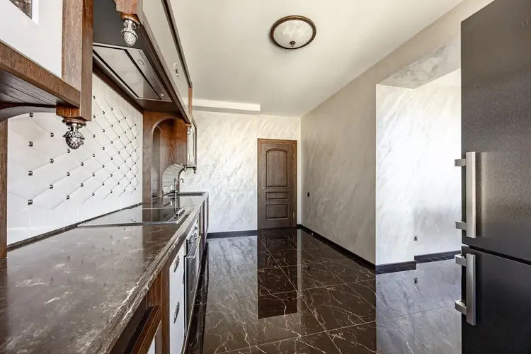 Итальянская роскошь: Керамогранит VERSACE, кухня VELIERO с техникой LIBHER, SMEG, FALMEC, венецианская штукатурка OTTOCENTO "мокрый шелк", двери PORTALLE из натурального дуба.