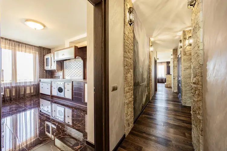Уникальные детали: натуральный облицовочный камень доломит (Дагестан), репродукция картин французского художника, бронированное остекление лоджии, осветительные приборы ручной ковки (Австрия).